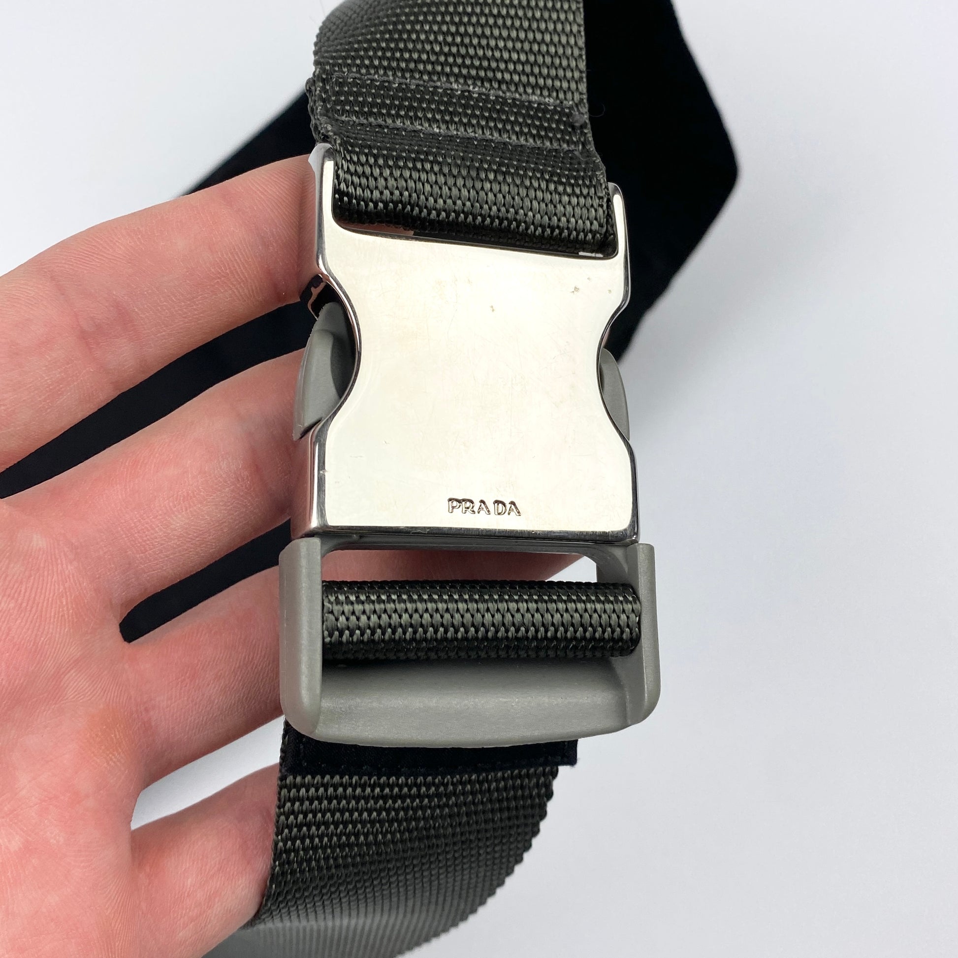 - Prada lettering on the buckle